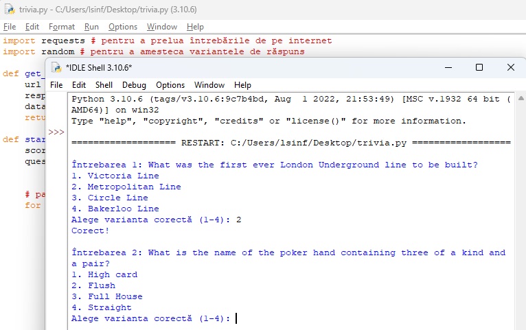 După afișarea întrebărilor, programul cere utilizatorului să aleagă varianta corectă, iar imediat verifică răspunsul.